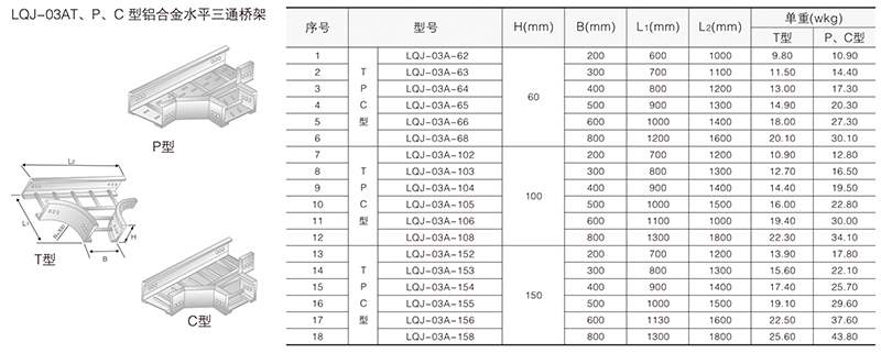 鋁合金電纜橋架在某種結構形式中無其它結構形式中的某-種產品類別,選型可作代用表示。例如:在LQU-CC型槽式鋁合金電纜橋架結構形式中,無鋁合金配線橋架中的LPC-03D, 即表示為LFC-CC-03D。